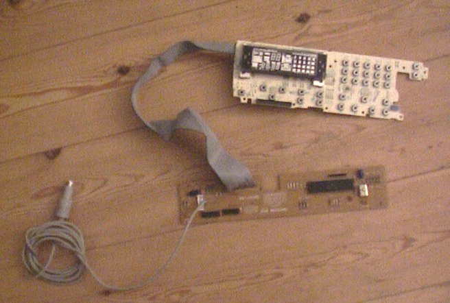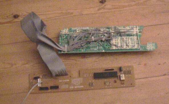 ![]() | OK, this the other printboard from the frontpanel, connected to an old printboard from a keyboard. I have soldered these two boards together because I wanted to remap the buttons on the frontpanel, and use them as a keyboard for the PC. |